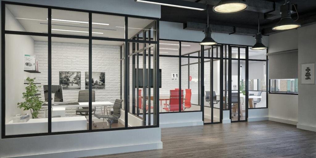 Interior glass and aluminum partitions that define spaces while maintaining openness and visual connectivity.