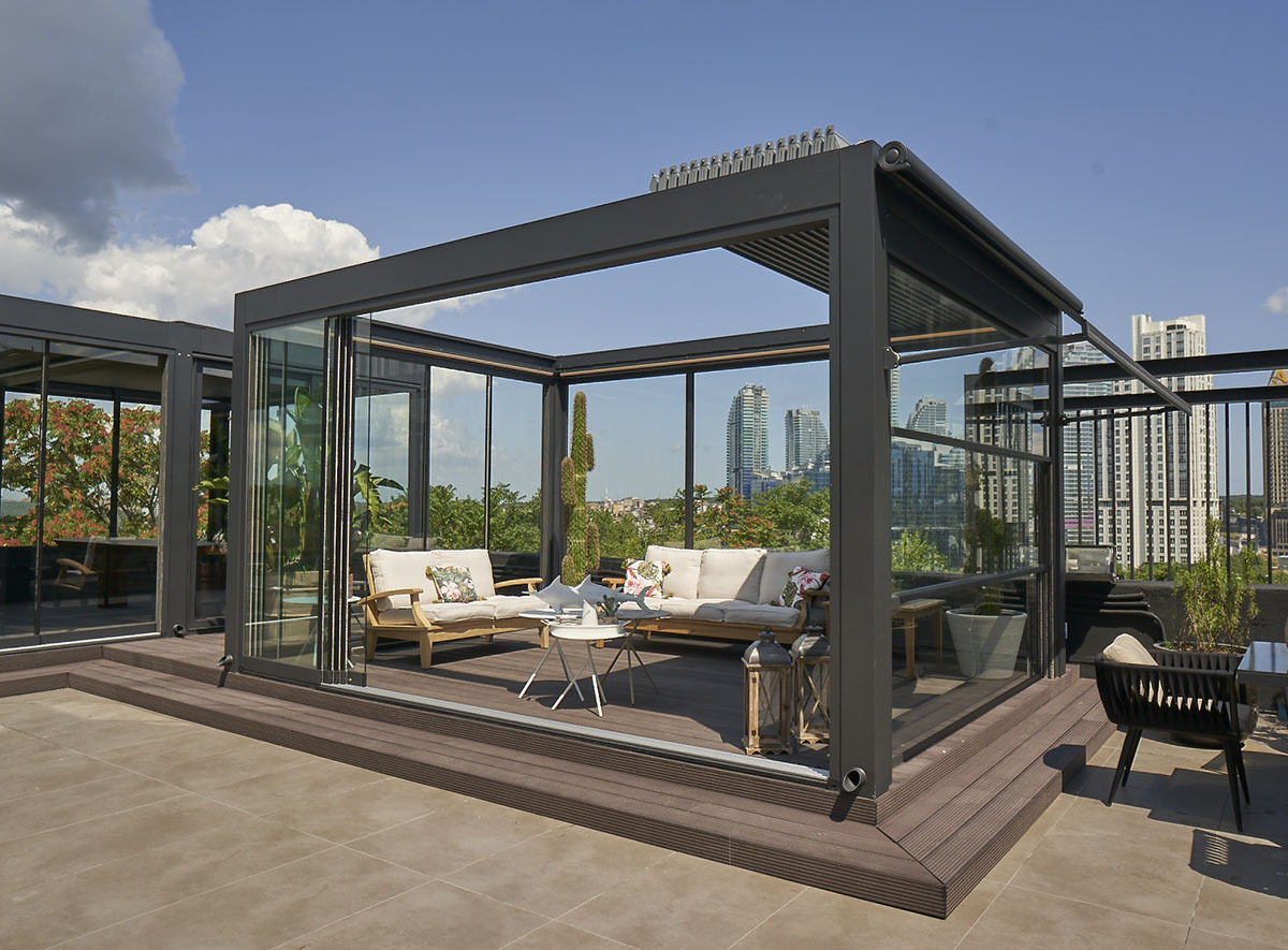 Custom outdoor structures combining glass and aluminum to create elegant covered spaces for any environment.
